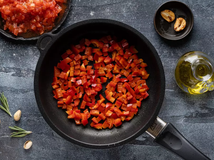 На сковороде разогрейте 2 ст. л. масла. Выложите очищенный и разрезанный пополам зубчик чеснока. Как только чеснок приобретёт золотистый оттенок, удалите его и выложите сладкий перец. Обжарьте до полуготовности, выложите помидоры и посолите. Тушите 5-7 минут на медленном огне до испарения жидкости, а затем поперчите.